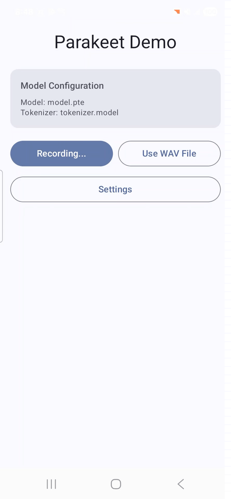 Speech recognition on Android. The Parakeet and Whisper Android apps let users record audio and transcribe it on-device. These are fully functional apps with model download, microphone recording, and transcription, available in the executorch-examples repository.