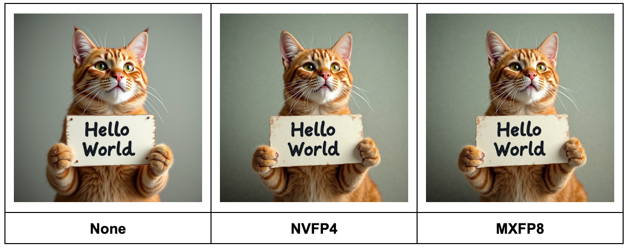 The MXFP8 and NVFP4 images generated for a test prompt are close to the bfloat16 baseline, with NVFP4 showing slightly larger differences vs MXFP8: