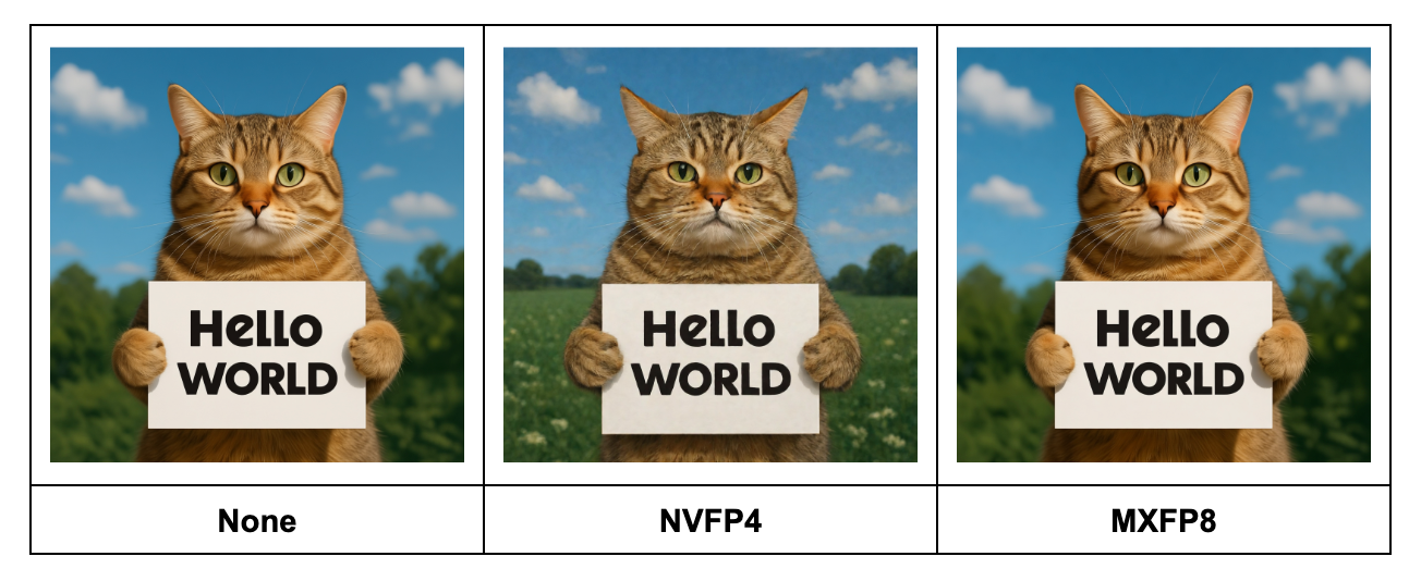 • MXFP8 (OCP Microscaling FP8): An 8-bit industry-standard format (E4M3/E5M2) from the Open Compute Project (OCP). It uses a block size of 32 with 8-bit scaling. It provides a “sweet spot” balance, delivering faster inference than BF16 with virtually no loss in visual quality (lower LPIPS), and often achieves the lowest latency at smaller batch sizes.