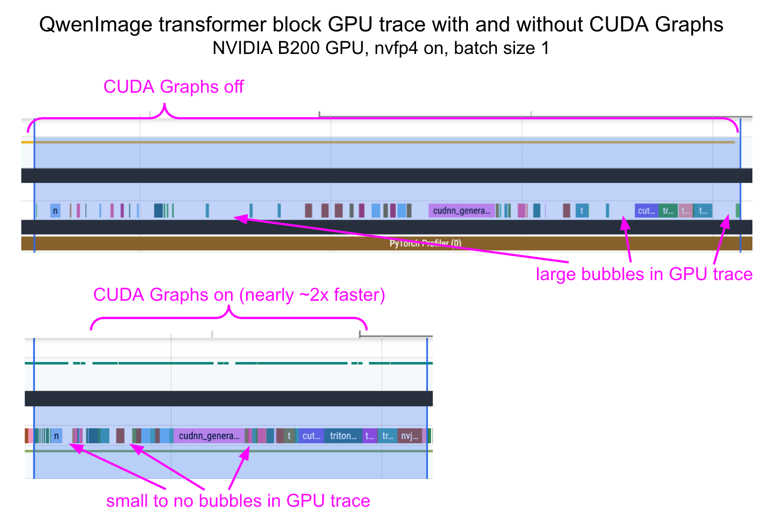 We noticed that when using NVFP4 with small batch sizes like 1, CPU overhead tends to have a nontrivial impact on latency improvements. To significantly reduce this overhead, we used the “reduce-overhead” compilation mode, which enables CUDA graphs. Below, we provide the profile traces before and after applying CUDA Graphs.