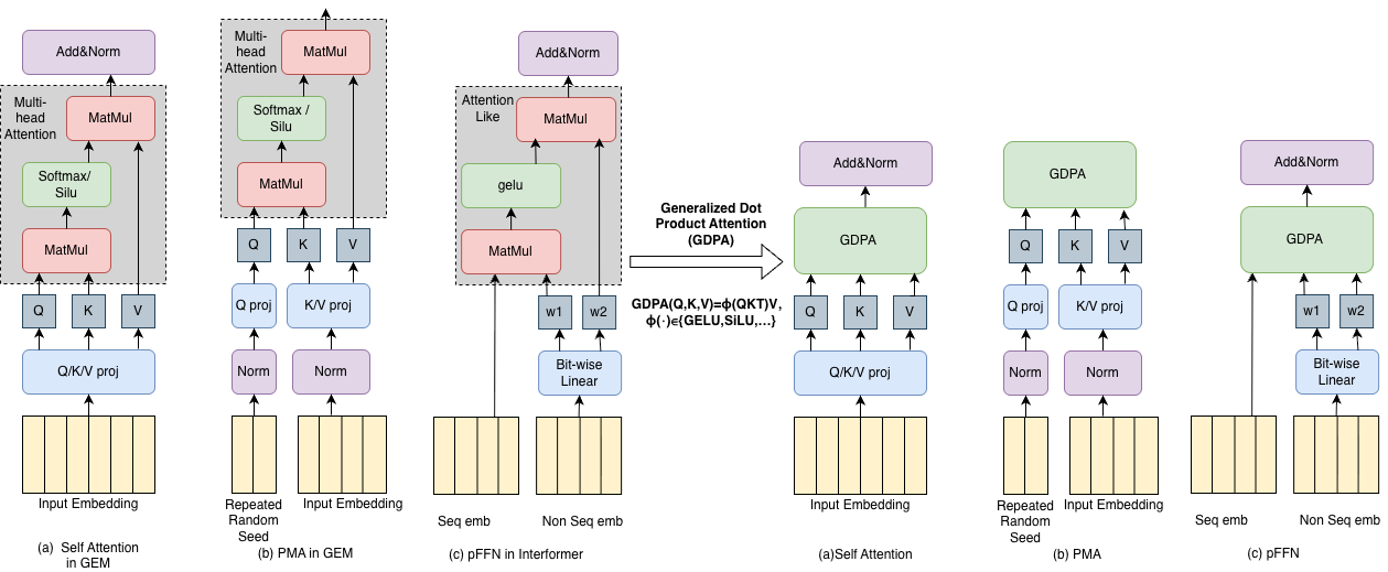 Fig. 1. (a) Self attention in GEM. (b) PMA in GEM. (c) PFFN in InterFormer. With the GDPA kernel, we unify all attention kernels into one similar implementation.