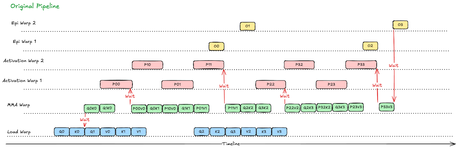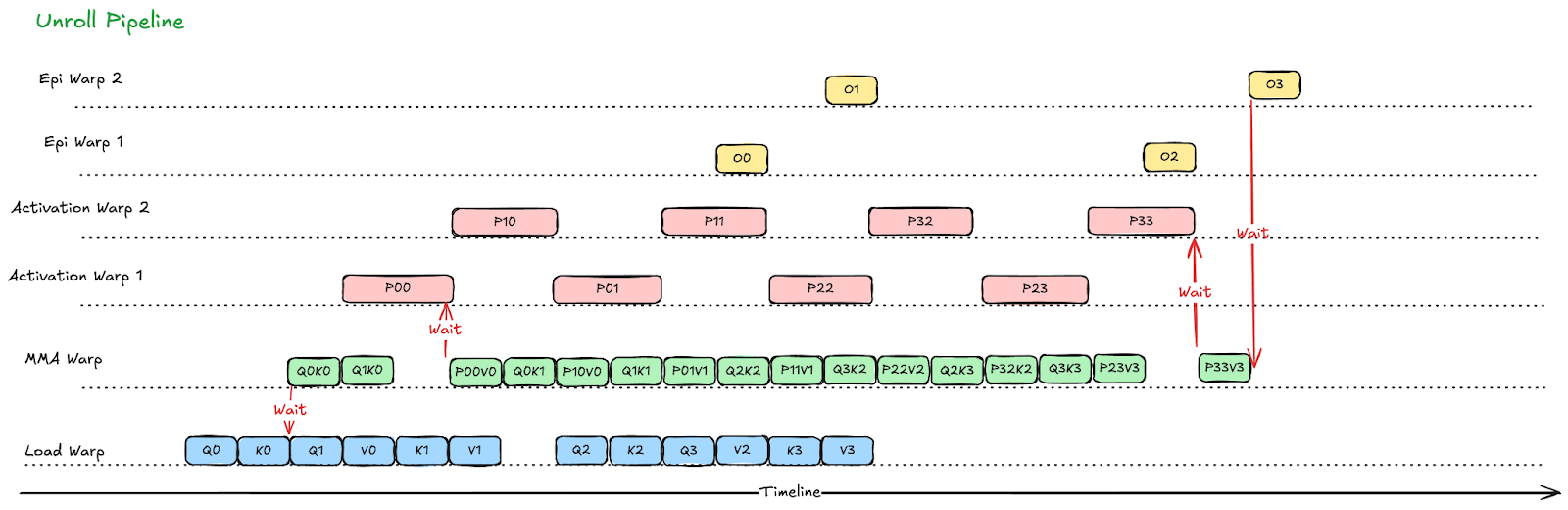 Fig. 4. After loop flattening, MMA and activation warps are better overlapped, reducing pipeline bubbles present in the original inner loop compared to Fig.3.