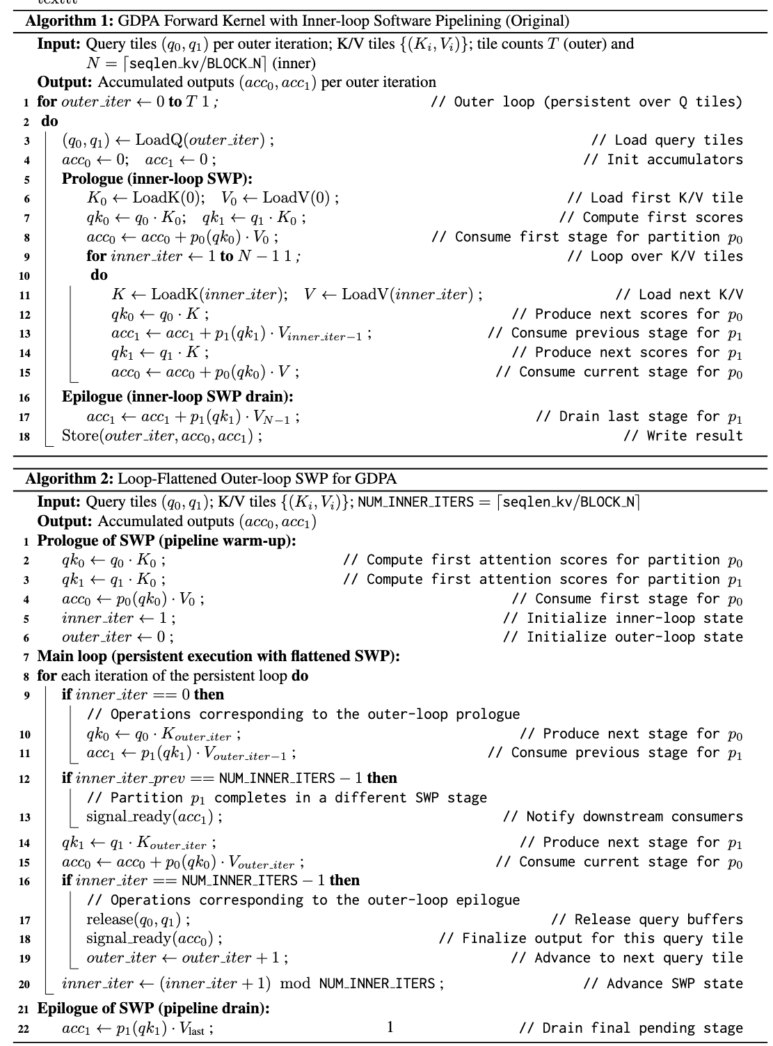 Another major bottleneck comes from very short K/V sequences, which are common in production workloads. In a persistent kernel, attention kernels are naturally expressed as a double-nested loop, where the inner loop iterates over the K/V dimension. The original inner-loop design assumes enough iterations to amortize pipeline setup costs as shown in Alg.1 below, but this assumption breaks down when the inner loop runs only a few iterations (e.g., when the kv sequence length is 128 or 256, the inner loop only runs once or twice with block size 128). In these cases, software pipelining on the inner loop becomes much less effective.