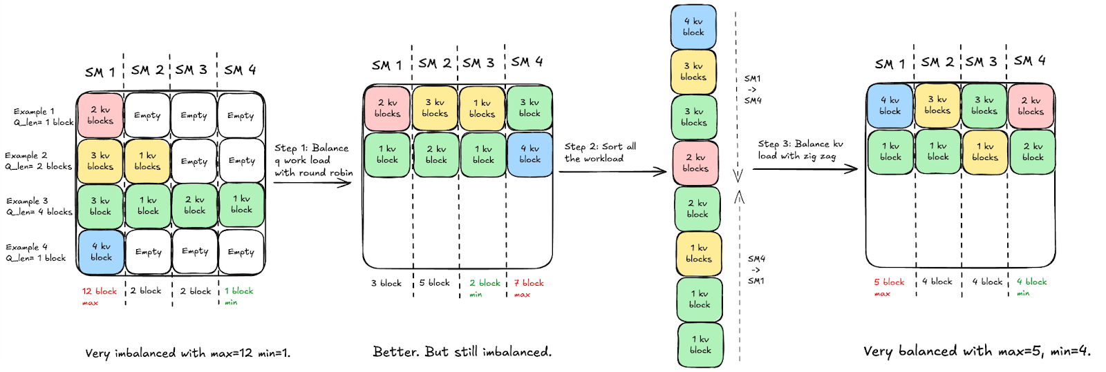 Fig. 5. Initial SM workloads are imbalanced due to variable-length inputs. We first balance the Q workload by removing empty tiles and assigning valid tiles in a round-robin manner, then further balance the K/V workload using a zigzag scheduling strategy.