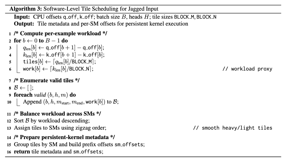 Alg. 3. Software-level tile scheduling for jagged tensor using precomputed valid tiles and zigzag assignment to balance persistent kernels
