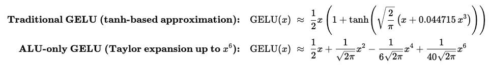Eq.1 Comparison of GELU approximations. The top equation shows the standard tanh-based GELU approximation, which uses 1 SFU instruction and 8 ALU instructions. The bottom equation shows an ALU-only Taylor expansion of GELU with 9 ALU instructions.