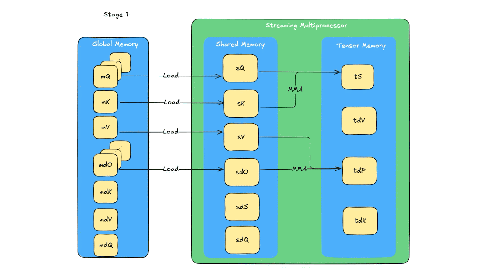The memory queue design reuses the same tensor memory and shared memory for multiple computations (due to limited space in tensor memory and shared memory). In Fig. 7, we show the details of memory reuse. The one related to our additional synchronization is that in stage 4, sQ’s shared memory space is reused for sdK, with producer being Q_reduce warp and consumer being TMA, similar for sdO’s memory. So there are two producers for sQ and sdO’s shared memory space. Because of that, an additional sync need to be added for the load warp (i.e. the warp loading Q, K, V, dO from global memory to shared memory) to wait for the warp to finish storing dK and dV because dK, dV use the same shared memory as dQ, dO which if not waited properly can be overridden by the Load warp.