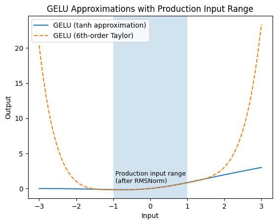 Fig. 6. Comparison between the standard tanh-based GELU approximation and a 6th-order Taylor approximation. Taylor expansion is accurate only within a bounded input range; in our production models, RMSNorm constrains activations to this range.