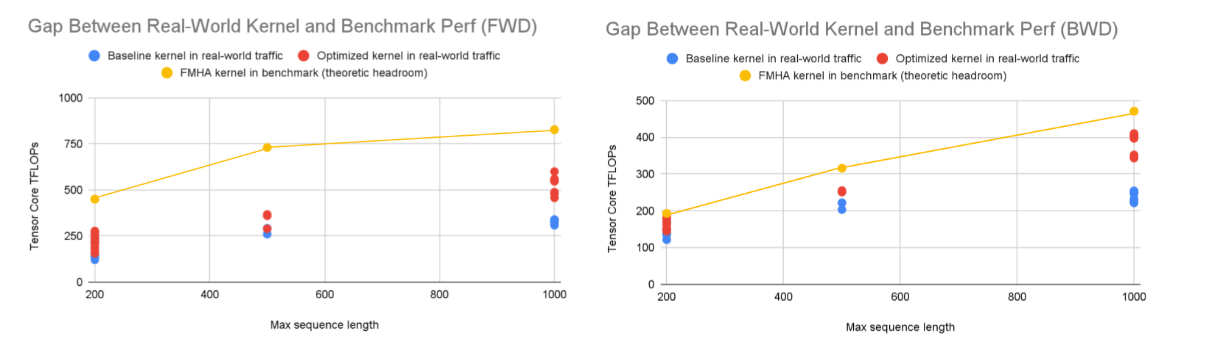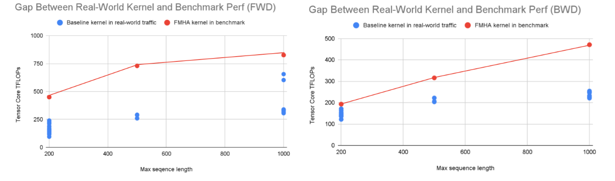 At the starting point, we observed that our original GDPA training kernel, adapted from latest Triton templates, performs poorly under real production workloads. As shown in Fig. 2, we compare real-world kernel performance against the CUTLASS FMHA benchmark, which is the fastest FlashAttention kernel we tested for our production shapes. The real-world kernel is evaluated using actual production data, while the benchmark is measured on synthetic data with the same maximum sequence length. The key difference lies in the data distribution: real-world data is driven by user behavior and does not follow a fixed distribution, while the synthetic data is generated using a normal distribution. On NVIDIA B200, real-world runs exhibit a 2.6× performance gap in the forward pass and a 1.6× gap in the backward pass relative to the benchmark, with worst-case gaps reaching up to 4×.
