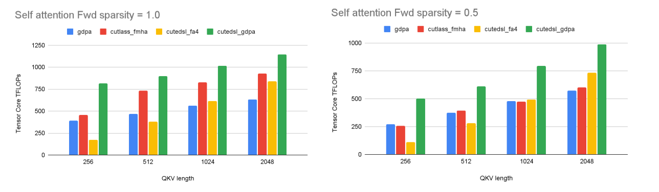 Fig. 8. Self-attention forward performance under dense (left, sparsity = 1.0) and jagged (right, sparsity = 0.5) inputs. Our optimized GDPA kernel consistently maintains higher throughput across both cases.