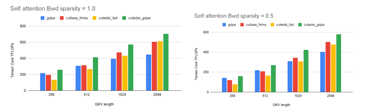We also evaluate self-attention backward performance, which is more challenging than the forward pass due to higher memory traffic and gradient accumulation. Under dense inputs, the optimized GDPA kernel achieves up to 1.6× speedup, reaching ~702 BF16 TFLOPs, while the gap to Blackwell FMHA narrows as backward computation becomes more bandwidth- and synchronization-bound as illustrated in Fig.9 . Under jagged inputs, although the relative differences are smaller, our optimized kernel still maintains an average ~1.3× speedup over the baseline. We attribute this behavior to the higher complexity of the backward pass, which requires more delicate pipeline tuning. In addition, since backward kernels are often shared-memory bandwidth bound, the transition from SDPA to GDPA provides less opportunity for performance improvement than in the forward pass, leaving further optimization potential for future work.