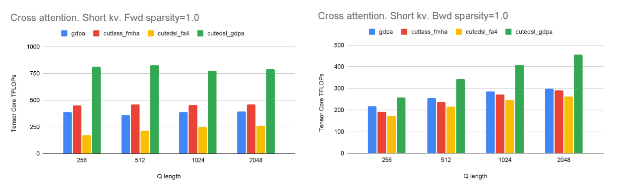 Fig. 10. Cross-attention performance with short K/V (256). Our optimized GDPA scales with Q length for both fwd and bwd, while FA4 plateaus in the short-K/V regime, with avg 3.5× forward and 1.6× backward speedup over FA4 under real-world production traffic settings.