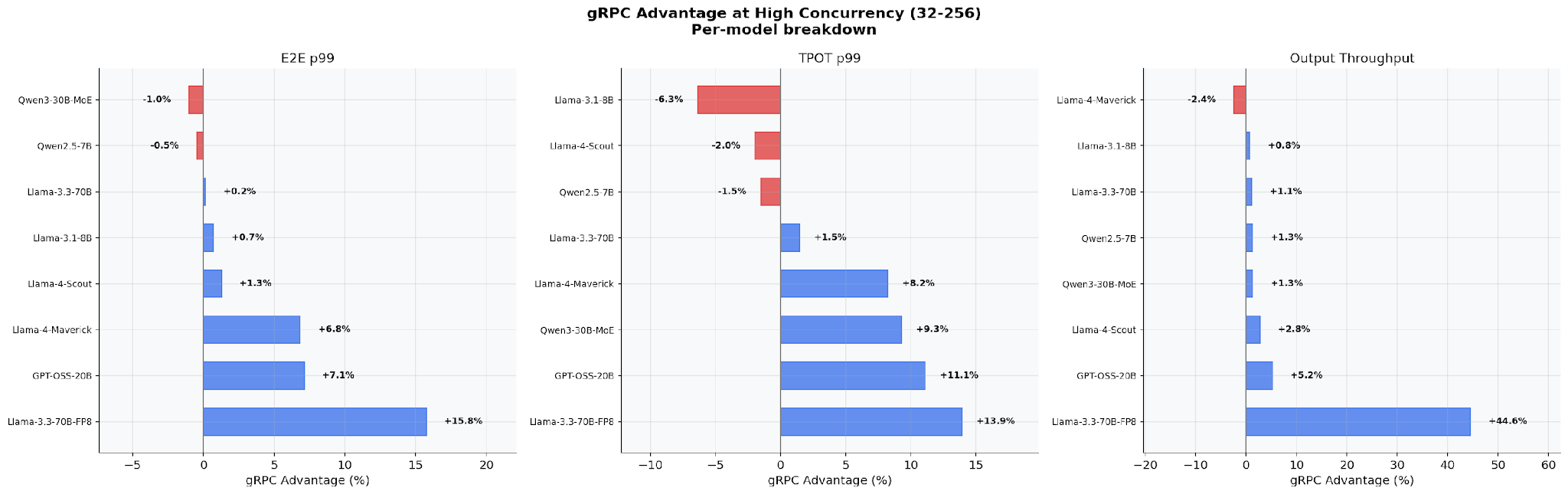 At production concurrency levels (32–256), the gRPC advantage varies by model architecture. Llama-3.3-70B-FP8 sees the largest gains (+15.8% E2E p99, +44.6% output throughput). Smaller dense models (Llama-3.1-8B, Qwen2.5-7B) show modest improvements. The pattern is clear: faster GPUs → larger gRPC advantage, because CPU overhead becomes a bigger fraction of total latency.