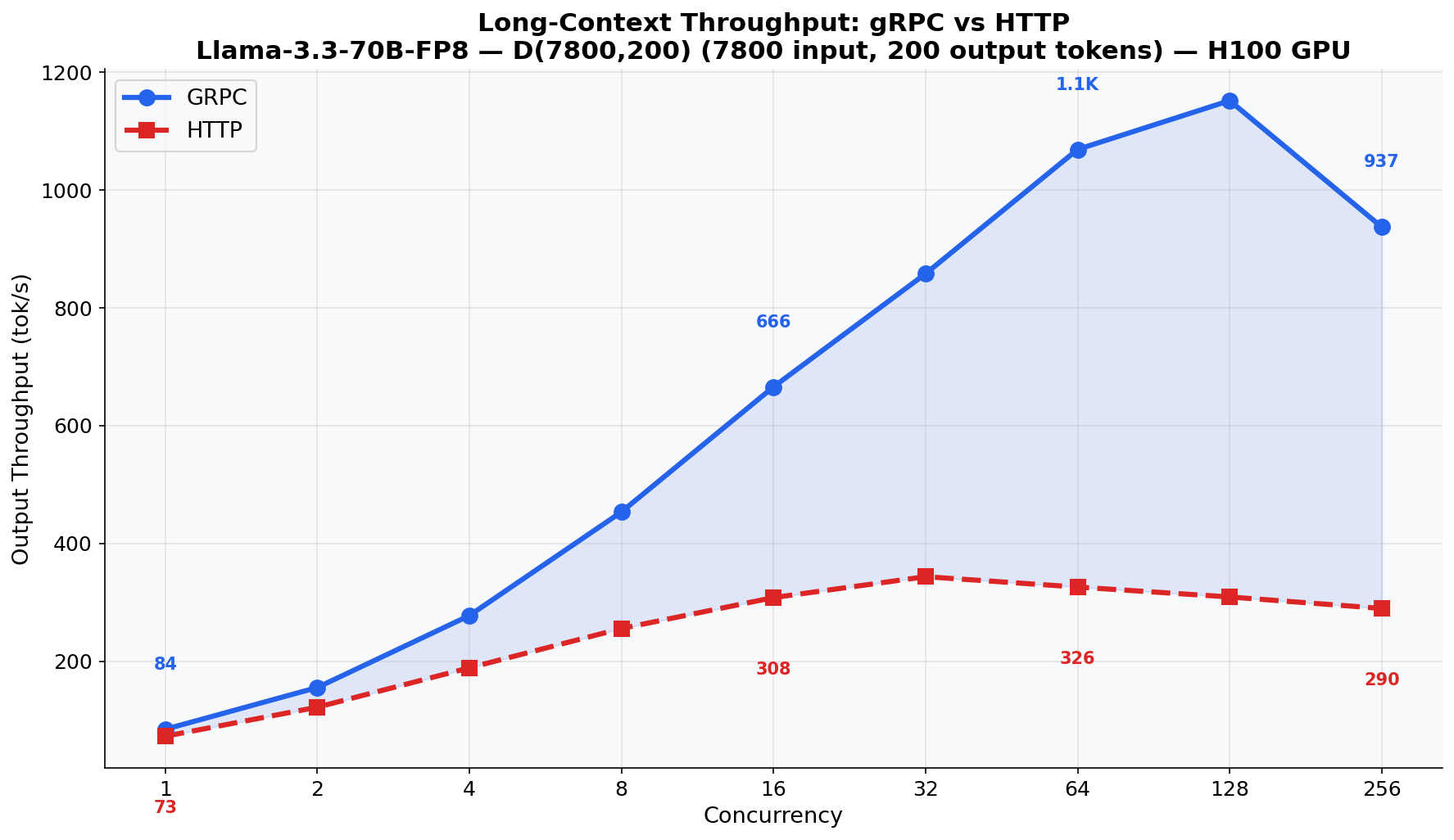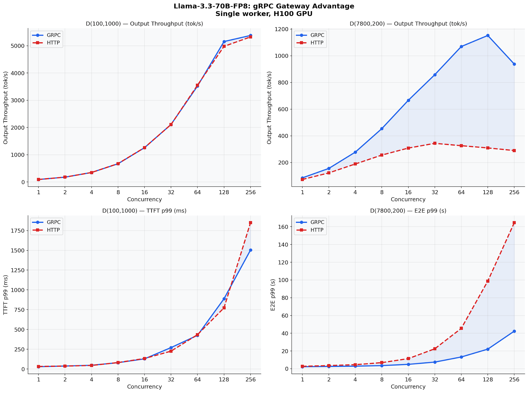 The most dramatic result: Llama-3.3-70B-FP8 with 7800-token inputs. This model, running FP8 quantization on H100, is fast enough that HTTP serialization becomes the dominant bottleneck. gRPC delivers up to 3.5x higher output throughput: 1,150 tok/s vs 327 tok/s.