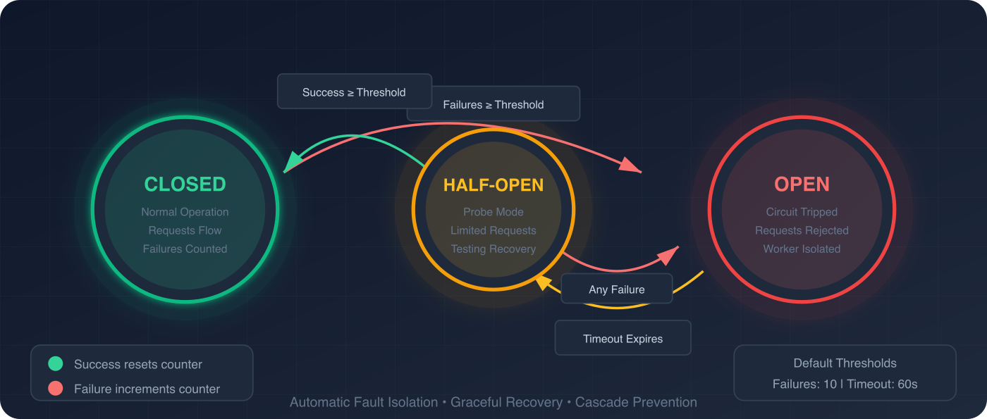 Per-worker circuit breakers (closed/open/half-open), automatic retries with exponential backoff and jitter, periodic health checks, concurrent request rate limiting, request timeouts, and configurable graceful shutdown. SWIM-protocol gossip mesh with CRDT-based state sync for multi-node deployments. Distributed rate limiting via consistent hashing across cluster nodes. Partition-tolerant by design.