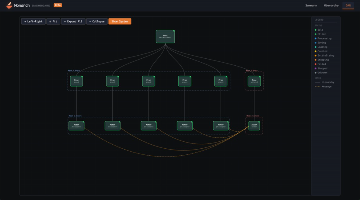 By representing your supercomputing cluster through a coherent model of hosts, procs, and actors, and pairing it with “batteries included” infrastructure, Monarch gives your agent superpowers! It can directly manage and debug running code, rapidly sync dependencies and data, run new code, and provision additional hosts, procs, and actors in an efficient and consistent way regardless of where it is deployed.