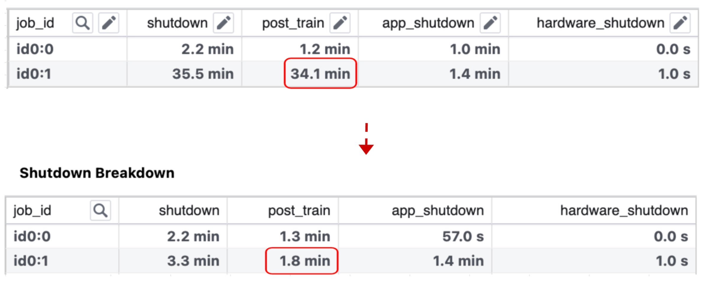 The team dived into each component of the shutdown phase, and found that the model publish processing (model publishing for inference) dominated the post-train process duration.
