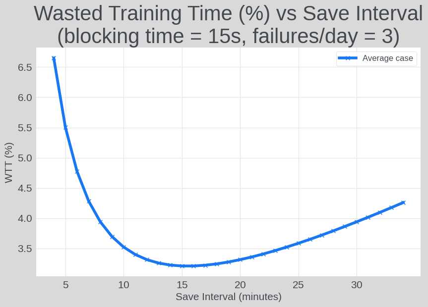 The following graph illustrates the relationship between checkpoint save intervals and the percentage of wasted training time (WTT%), using a hypothetical scenario with a 15-second checkpoint save blocking time and 3 daily failures.