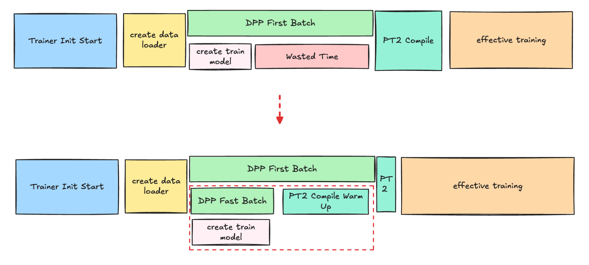 For example, the PT2 compilation and DPP warm-up (data process we used to fetch training data) to get the first batch of data, are costly and time-consuming steps that occur before the actual training begins. Currently, the PT2 compilation is delayed, as it can only start once the first batch of real data is available for the compilation process.