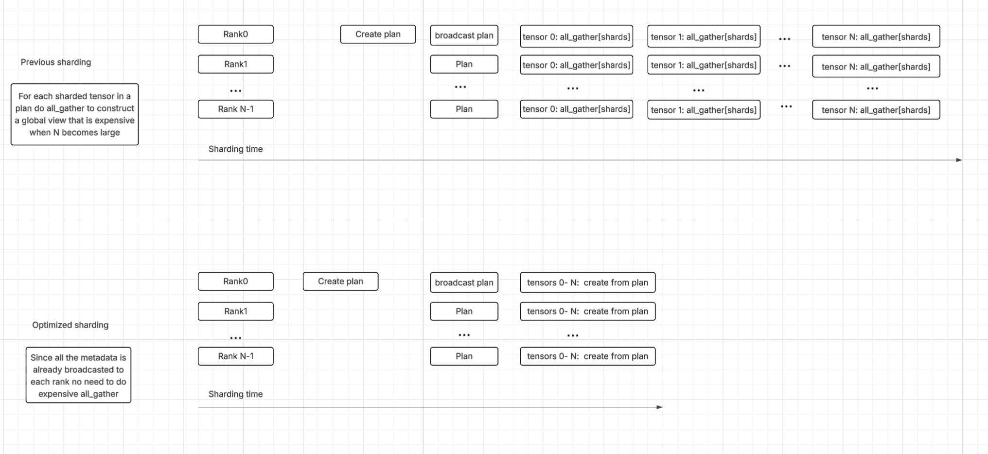 For instance, instead of relying on numerous all_gather calls to build shard metadata piece by piece—a method that caused substantial overhead in the sharding process—the team implemented an optimization. They now have each rank build its section of the global rank using metadata that is already locally available after the sharding plan broadcast. This change significantly improved sharding time.