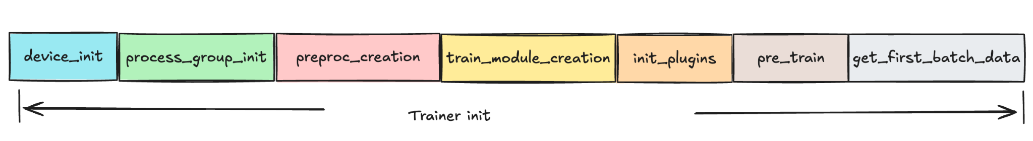 Trainer initialization comprises multiple sub-stages: device_init, process_group_init, preproc_creation, train_module_creation, init_plugins, pre_train, and get_first_batch_data.