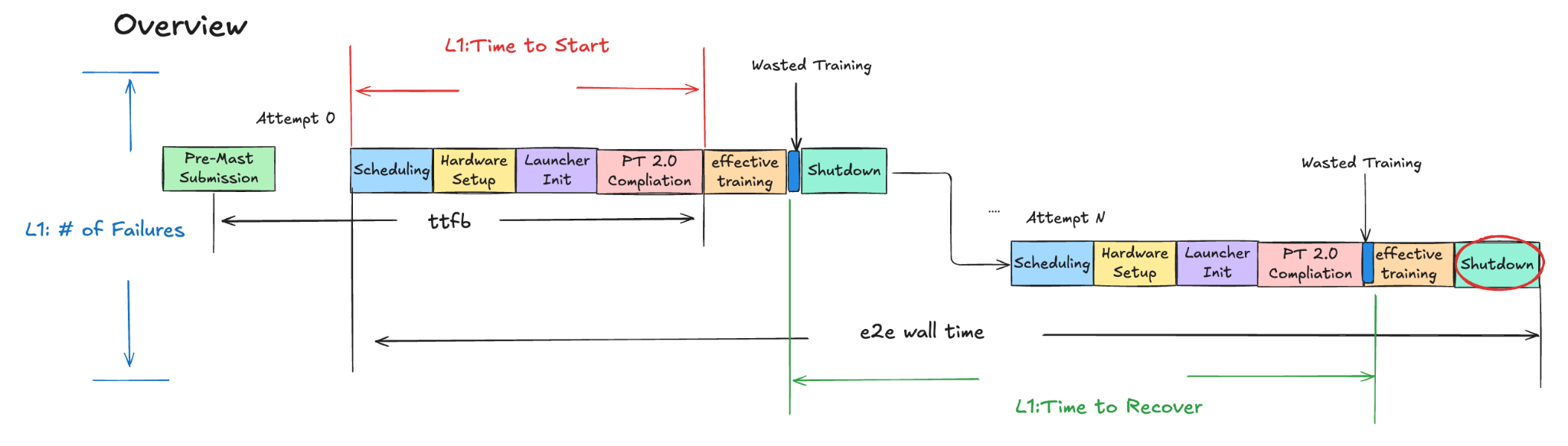 - Number of Failures: refers to the total count of infra-related interruptions or unsuccessful attempts that occur during the lifecycle of a training job.