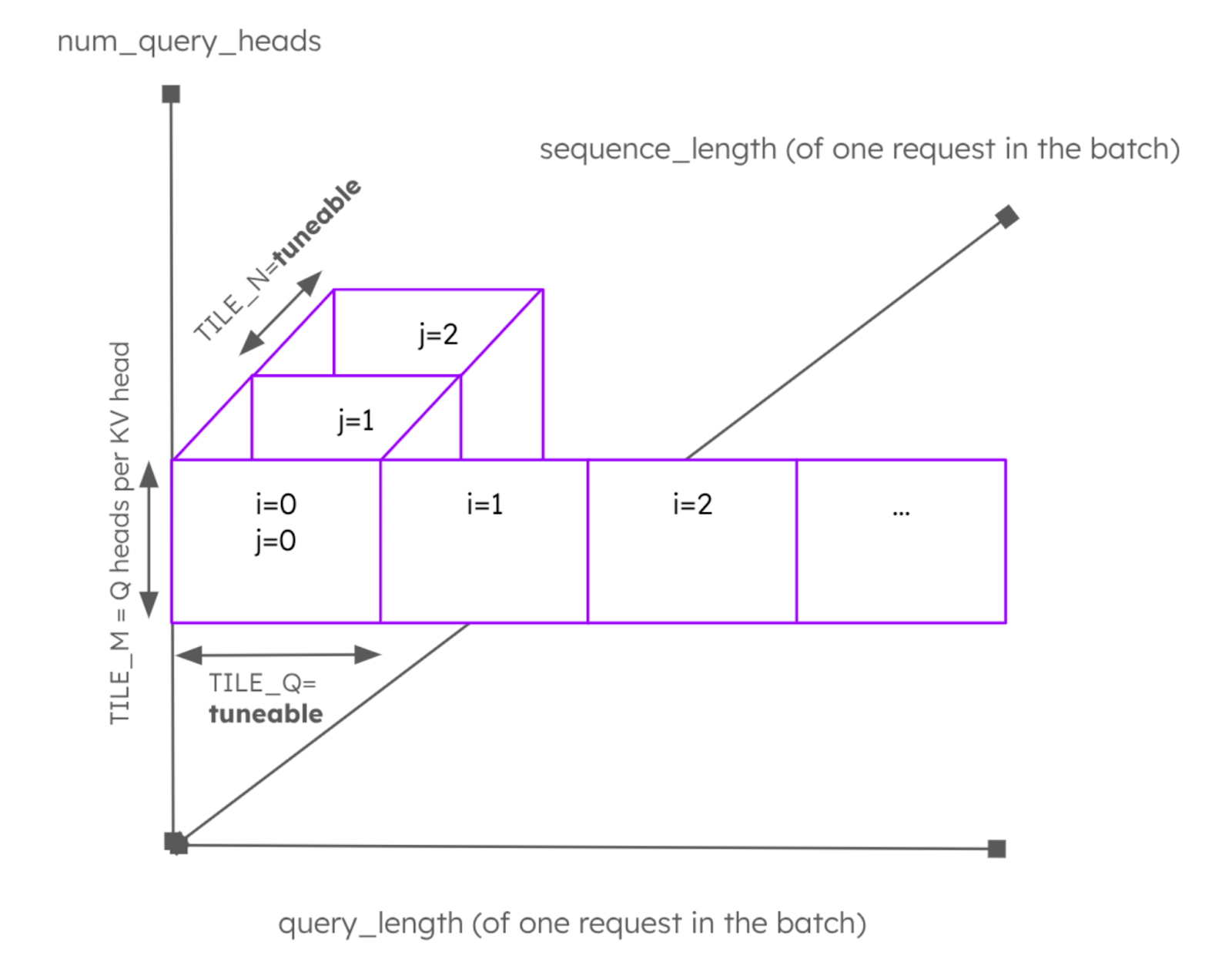 Next, the second loop is then over the query length of the selected sequence with a tuneable tile size. But please note that we pad the upper bound of this tile size (see q_block_padded_size), so that neither the JIT compiler nor the autotuner are triggered for all possible combinations of query lengths. Instead, we provide here only padded length to the power of two, which reduces the JIT/autotune overhead at runtime. The innermost loop is over the number of KV cache pages in the selected sequence. Hence, also the upper bound of the corresponding registered block size means 32 pages of KV cache memory (each of e.g. 16 tokens).