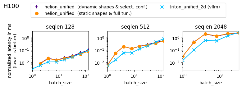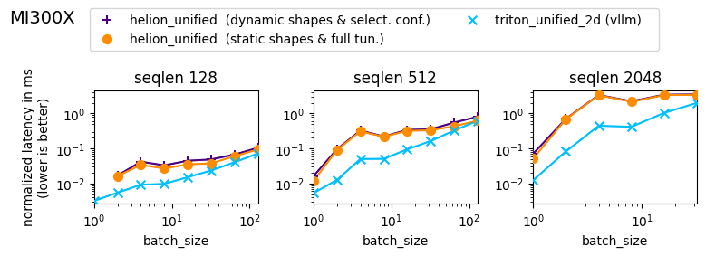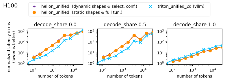 However, also here the Helion kernel is on-par or outperforms the Triton kernel for decode-only requests, and therefore we can consider our kernel implementation as platform and performance portable.