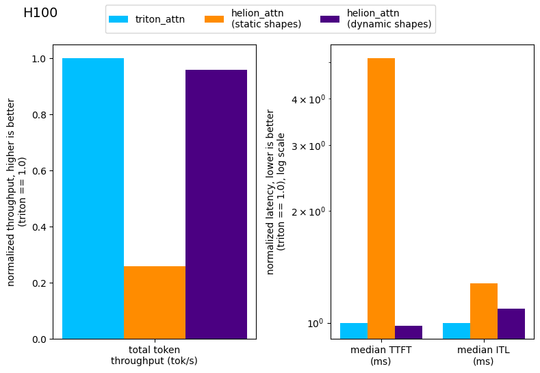 As can be seen in the Figure, Helion with static shapes achieves only roughly 26% of Triton’s total throughput, while Helion with dynamic shapes achieves 96% of the total token throughput and is also on par in TTFT (Time-to-first-token, i.e. the prefill time) and very close in ITL (Inter-token-latency, i.e. the time to decode one more token).