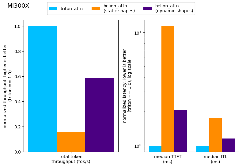 On MI300X, our backend works as well, but achieves only 59% of the total token throughput using dynamic shapes. This result is not surprising, because already our micro-benchmark showed that on MI300X the gap between the Helion kernel and the Triton kernel for prefills is larger.