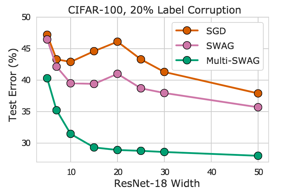 Indeed, we see in Figure 8 that MultiSWAG entirely mitigates double descent – more flexible models have monotonically improving performance – and provides significantly improved generalization over SGD. For example, when the ResNet-18 has layers of width 20, Multi-SWAG achieves under 30% error whereas SGD achieves over 45%, more than a 15% gap!