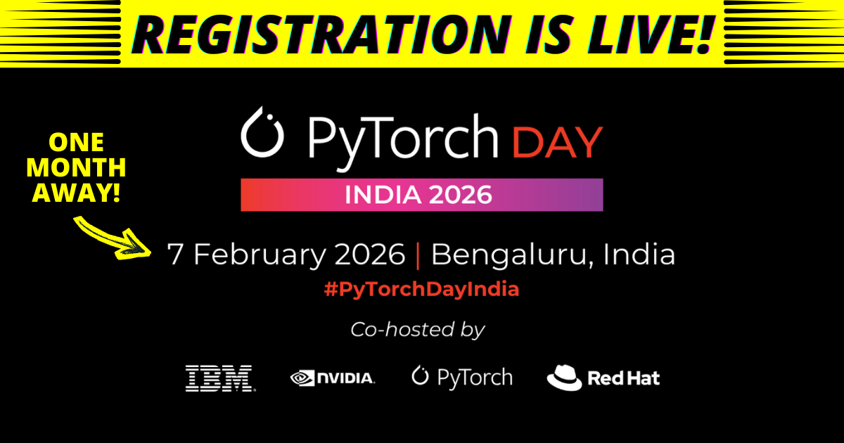 PyTorch Day India 2026 brings the PyTorch community to Bengaluru on 7 February 2026. Hosted by PyTorch Foundation and co-hosted with IBM, NVIDIA, and Red Hat, the event focuses on open source AI and machine learning through a full day of technical talks, discussions, and poster sessions. REGISTER TODAY
