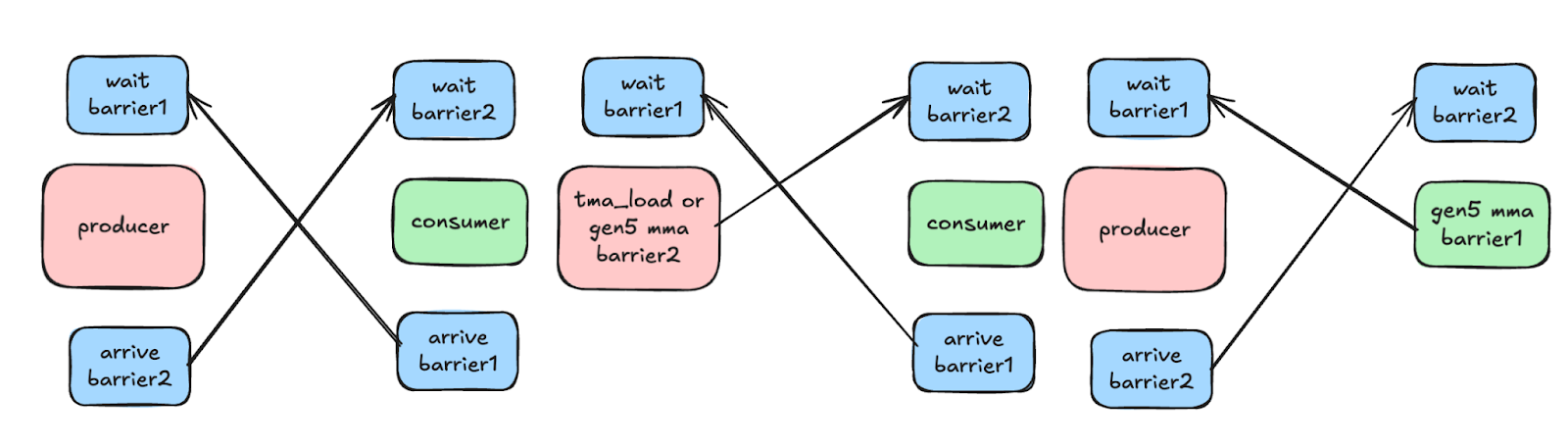 The code partitioner sets up synchronization mechanisms as follows. For each channel, we assume that the source op and destination op are in the same scope and will be executed the same number of times. Code partitioner uses one accumulated index count to track the number of executions, and computes buffer index and phase based on the accumulated index count and number of buffers for the channel. Code partitioner uses two barriers for synchronization between source and destination of the channel. It can reuse existing barriers associated with TMA/gen5 GEMM if the source or destination comes from TMA/gen5, respectively.