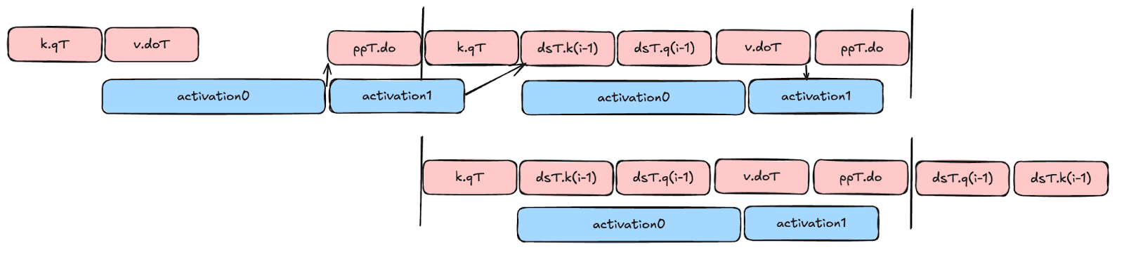 In the above example, consecutive iterations of the attention forward loop are pipelined, overlapping two dot products and a softmax computation from different loop iterations.
