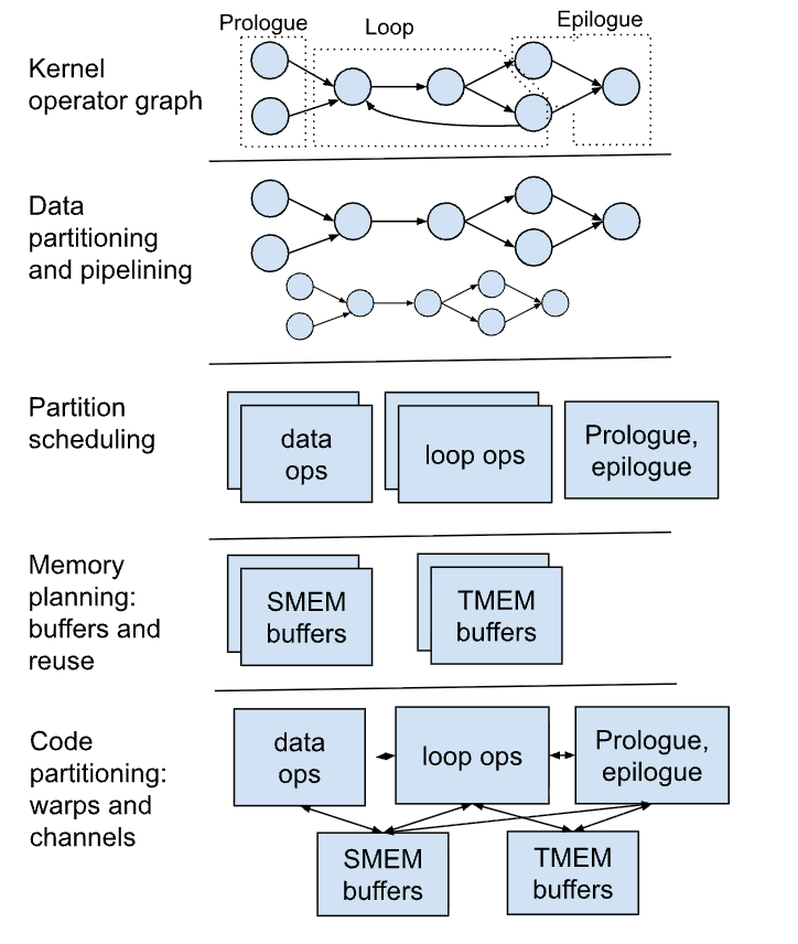- Analyze and create communication buffers between the partitions (Buffer Creation), where buffers can be in either shared memory (SMEM) or tensor memory (TMEM) (for newer generations of NVIDIA accelerators).