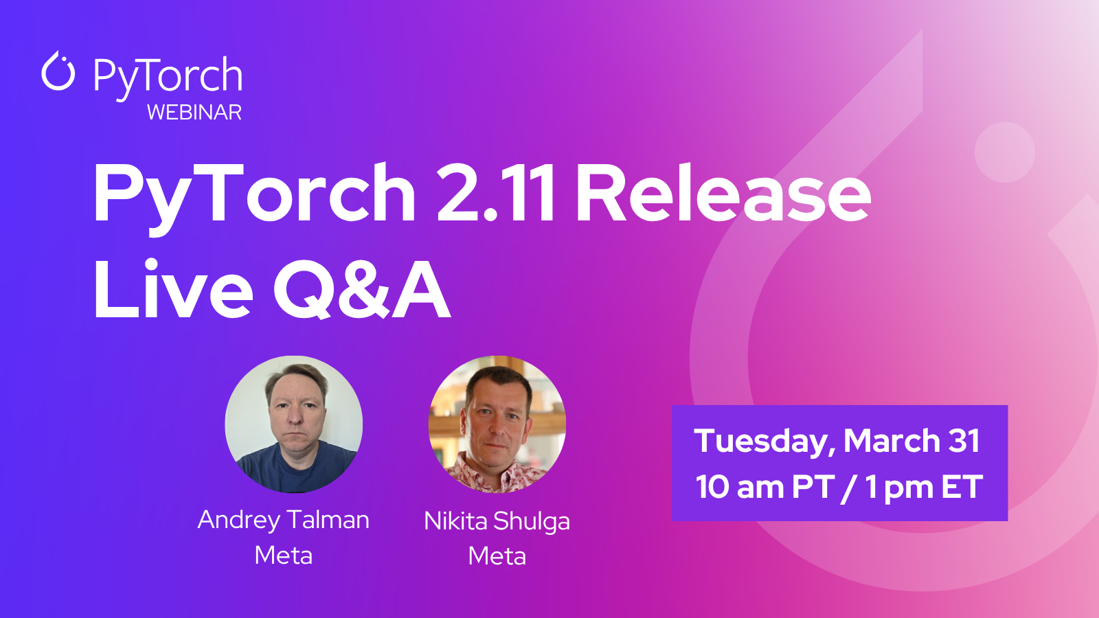 The PyTorch 2.11 release features a number of improvements for distributed training and hardware-specific operator support. On Tuesday, March 31st at 10 am, Andrey Talman and Nikita Shulga will give a brief update on the release and answer your questions. Register today!